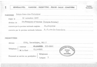 Le Révérend Monsieur G. Monge ancien desservant du Parc Terminal avant la fondation de Notre Dame Des Victoires (1907).
